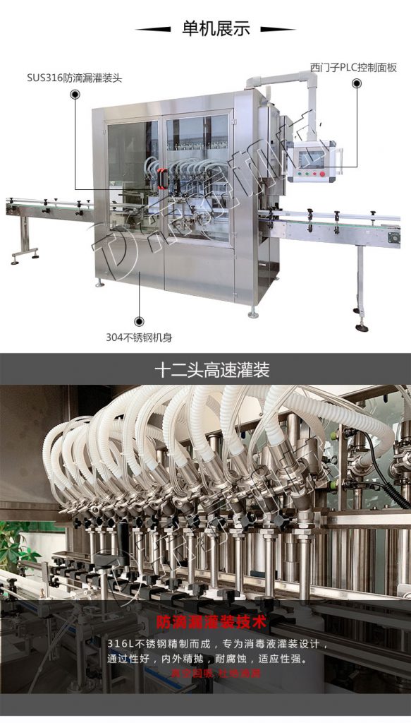 應(yīng)用領(lǐng)域:適用于食品飲料、醫(yī)藥、化工、農(nóng)藥等行業(yè)中各種流動(dòng)液體的灌裝。如果消毒液、酒精、殺菌劑、溶液等。
