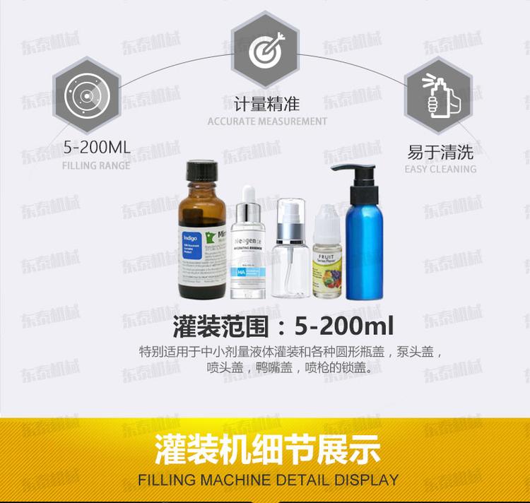 該消毒水液體灌裝旋蓋線適用于食用油,果汁,飲料,礦泉水,牛奶,口服液,煙油,滴眼液,精油,化妝水,藥油,膠水,酸奶,墨水,糖漿,葡萄酒,黃酒,米酒等定量灌裝和封蓋,自動化生產,大大提升效率,節省人力成本。